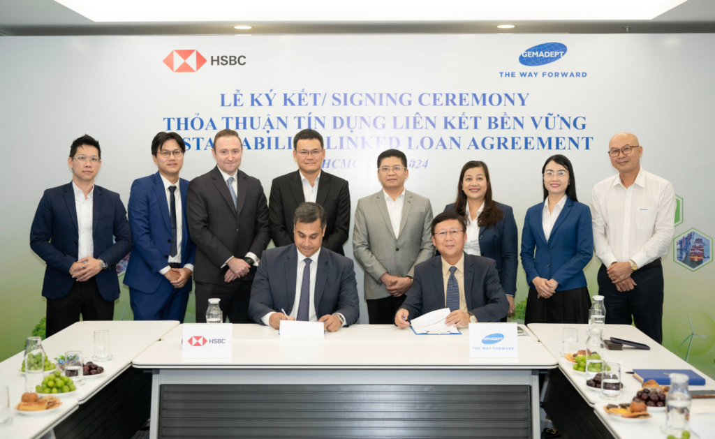 Ông Nguyễn Thanh Bình (bên trái), Tổng Giám đốc Gemadept, và đại diện Lãnh đạo Ngân hàng HSBC ký kết Thỏa thuận Tín dụng Liên kết Bền vững, đánh dấu một bước tiến quan trọng trong chiến lược tài chính xanh của Tập đoàn.