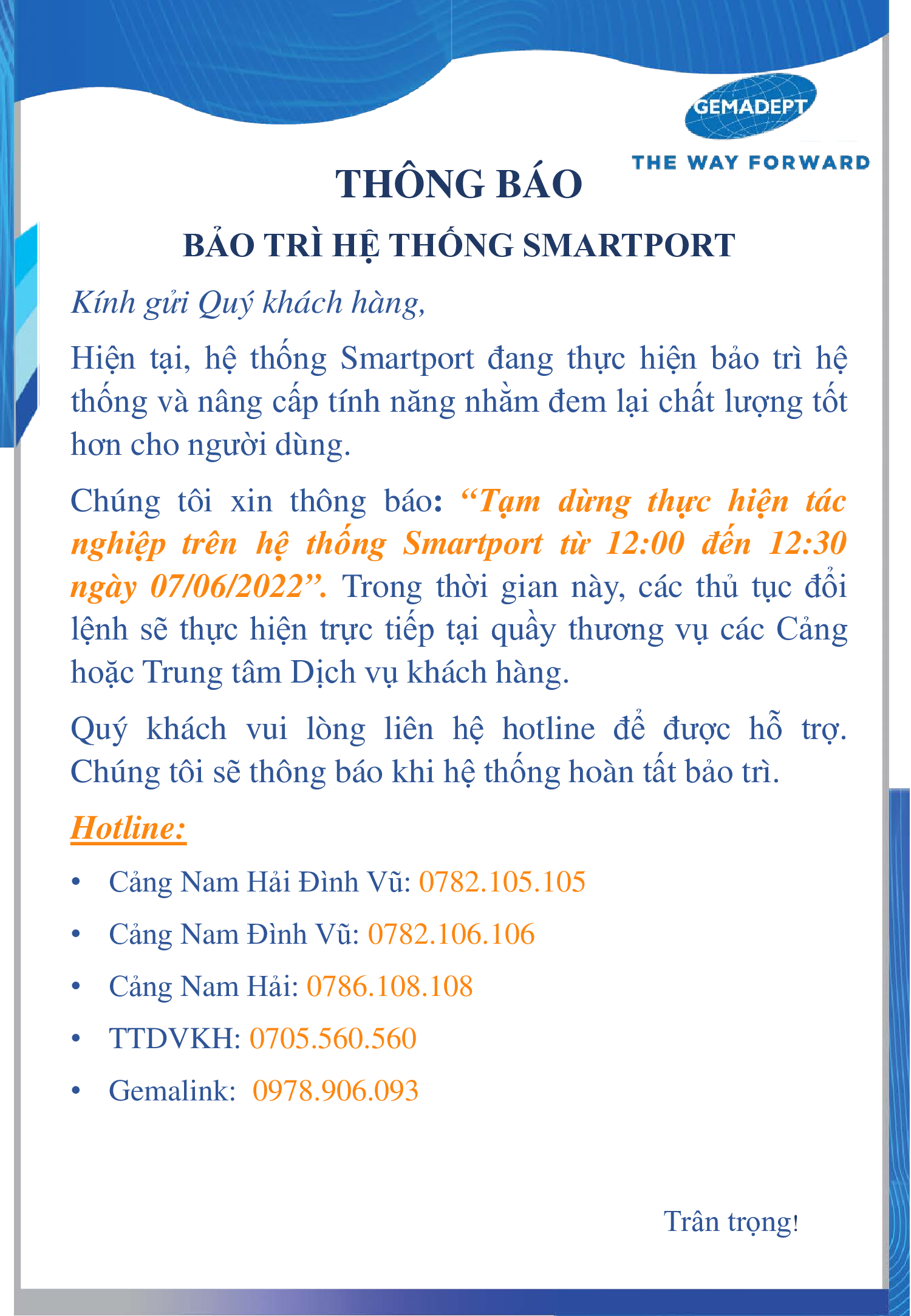 Từ 12:00 đến 12:30 ngày 07/06/2022, Hệ thống Smartport đã tiến hành bảo trì và nâng cấp nhằm mang lại trải nghiệm sử dụng tốt hơn đối với khách hàng.