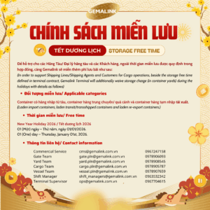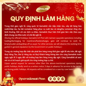 🔹 Để đảm bảo duy trì hoạt động và phục vụ tốt nhất cho các Hãng tàu, Đại lý Hãng tàu và khách hàng trong dịp Tết Dương lịch 2026, chúng tôi xin thông báo kế hoạch làm hàng tại cảng Gemalink Int’l Port như sau: