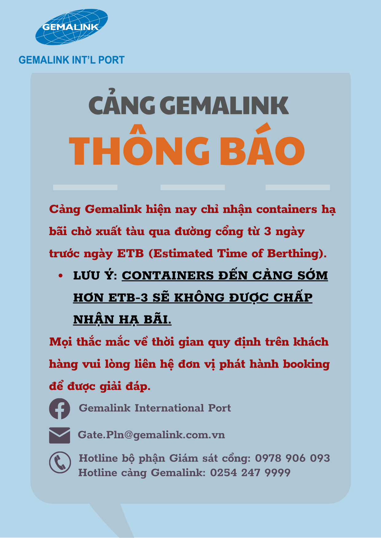 Cảng Gemalink hiện nay chỉ nhận containers xuất tàu qua đường cổng từ 3 ngày trước ngày ETB (Estimated Time of Berthing).